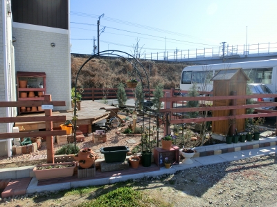 ウッドデッキが付き、花壇、地面の砂利、器具小屋と、だんだん
